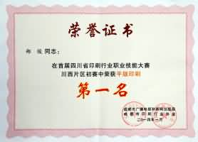 2012年獲得第三屆全國印刷行業職業職能大賽(四川賽區)選拔賽平版印刷類二等獎